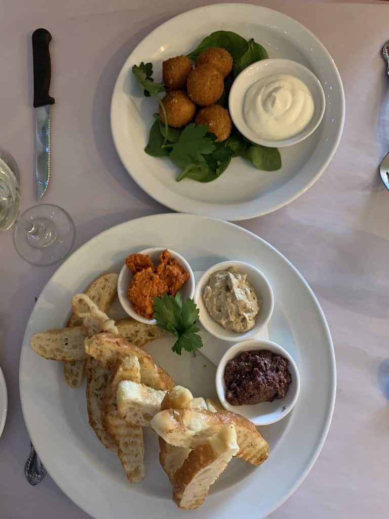 There’s one main high street in Apollo Bay and our hosts suggested a few different places for us to try for dinner. We ended up settling on The Sandy Feet Cafe and we weren’t disappointed! It had such a chilled vibe (just like you’d expect in Australia!) and the food was so good. We started by sharing some bread which came with different homemade dips (humus, olive spread and a sun dried tomato paste) and some arancini – both were delish and we polished off the lot!